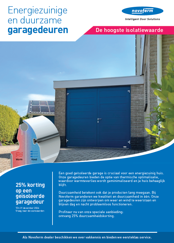 te werken met verschillende dealers verspreid door het hele land. Novoferm heeft dit najaar in samenwerking met MATHPEETERS de actie: "25% korting op sectionaaldeuren met aandrijving en 10% introductiekorting op de geheel vernieuwde dubbele deur garage de DuoPort". Dit zijn weer acties waarmee Novoferm in samenwerking met MATHPEETERS de handen ineen hebben geslagen.